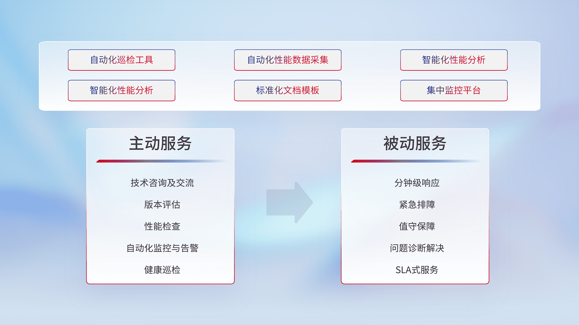 智能化工具和标准化文档,,,,保障服务质量,,,提供主动服务(包含技术咨询、、版本评估、、、性能检查、、、自动化监控与告警、、、、健康巡检)和被动服务包含(分钟级响应、、、、紧急排障、、、、值守保障、、问题诊断解决、、、、SLA服务)。。。。